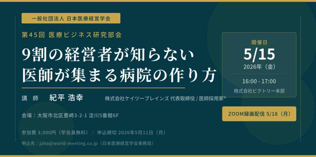【セミナー・イベント情報】2026/5/15(金)第45回 医療ビジネス研究部会(日本医療経営学会) 2026 4/09 お知らせ 講演・セミナー告知 2026年4月9日 URLをコピーしました! 一般社団法人 日本医療経営学会 医療ビジネス研究部会にて、弊社代表、紀平が講師を担当いたします。詳細はセミナー・イベント情報をご参照ください。 お知らせ 講演・セミナー告知 医師採用 医師採用ノウハウ 医師採用参謀 採用力 株式会社ケイツーブレインズ 紀平浩幸 講演・セミナー この記事をシェアするならこちらから URLをコピーしました! 「サービス・料金」ページを全面リニューアルしました。 関連記事 「サービス・料金」ページを全面リニューアルしました。 2026年3月20日 【先着5名様】「刺さる」医師採用サイトの設計書(医師採用LP設計ガイドVer.1.0) 無料進呈のご案内 2026年3月11日 医療情報紙「QOL VIEW」2026年3月号に取材記事が掲載されました。 2026年3月5日 生成AI(Claude Code)を活用して「即時予約システム」を自社開発。無料相談のご予約がスムーズになりました 2026年3月4日 代表挨拶を最新の内容に変更しました。 2026年1月6日 【セミナー・イベント情報】2025/12/2(火)医療マネジメントゼミTerraco(てらっこ) 2025年11月28日 ブログ「医師が集まる病院の作り方」開設のお知らせ 2025年11月16日 「サービス」「実績一覧」を更新しました。 2025年11月9日